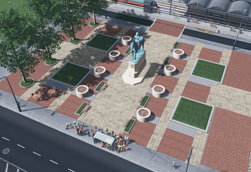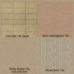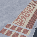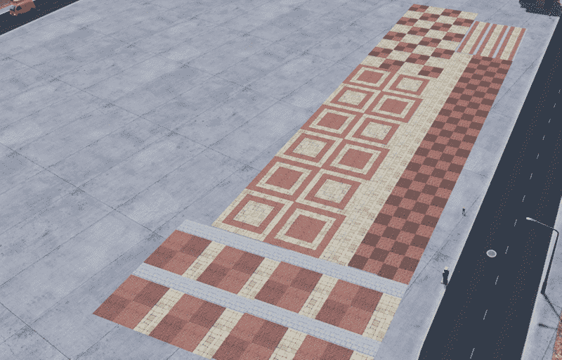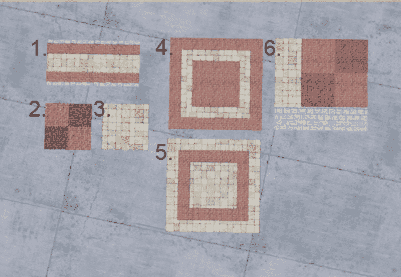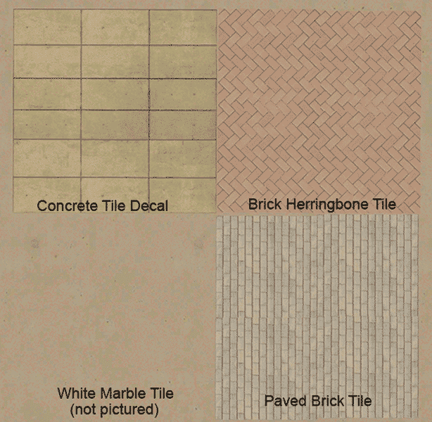a collection of tile decals using a combination of the vanilla tile texture, boformer’s paving ground texture, and a random brick texture from textures.com which also happens to be another of boformer’s decals only lighter.