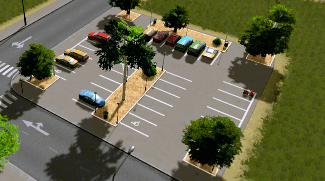 Over 50 props/trees were added. The Probability Changer mod was used to vary the frequency at which each tree in the parking lot grows. Each time the parking lot is placed, it will take on a new look depending on which trees grow. The user does not need to install the Probability Changer mod to make use of this feature.