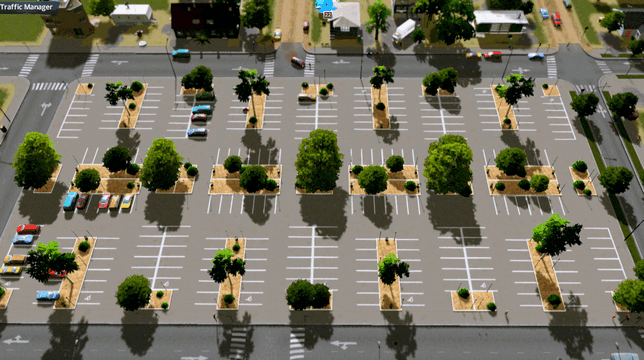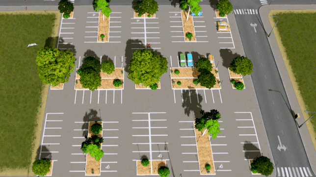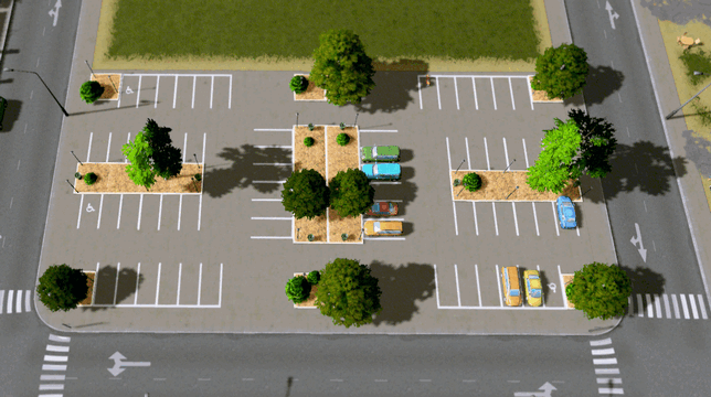 Over 50 props/trees were added. The Probability Changer mod was used to vary the frequency at which each tree in the parking lot grows. Each time the parking lot is placed, it will take on a new look depending on which trees grow. The user does not need to install the Probability Changer mod to make use of this feature.