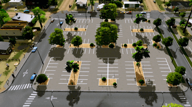This 4×4 parking lot is intended for a high end commercial area. It includes numerous landscaped islands and is also symmetrical so multiple instances of this parking lot can be placed next to each other or across from each other to create larger parking lots (4×4, 4×8, 8×8, 8×4, 12×8, etc.).