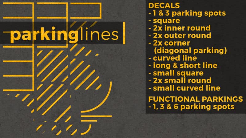 Dieses Decal & Prop Paket ist so gestaltet, wie es jedes Unternehmen braucht. Wir warfen einen Blick in den aktuellen Workshop und fanden viele verschiedene Parkflächen und Linien, jedoch ohne ein gemeinsames Konzept mit hoher Kompatibilität zueinander. Lass deine Cims etwas Park-Seelenruhe finden! Jedes Paket ist in weiße und gelbe Texturen unterteilt. Die weiße Texturenversion findest du hier.