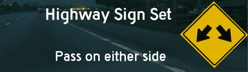 A sign used to indicate that it is safe to pass on either side of an obstruction or two highway ramps.