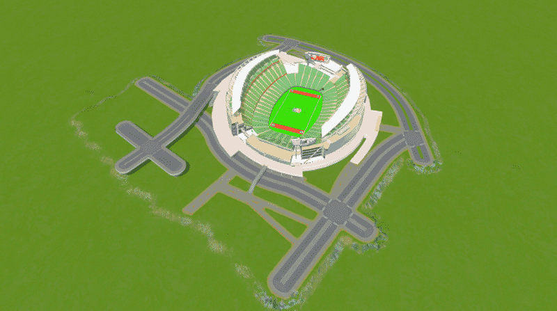 – Model is slightly raised up (6 meters, retaining wall is included), because the central field is slightly sunken into the ground, resulting into gray textures. Because of this I had to give up any extra amenities (such as built-in pedestrian paths and road overpasses) as reloading the asset would mess up roads. However, once you place the building in your city, you can still replicate the real thing pretty closely.