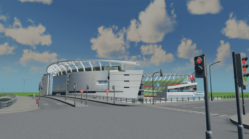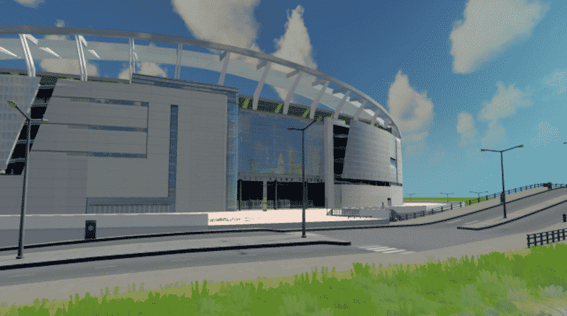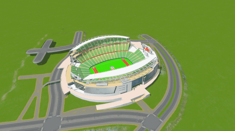 – If you wish to replicate the original stadium layout (as shown in the pictures), add roads and pedestrian paths accordingly. Build and link pedestrian paths inside the building around the central field.