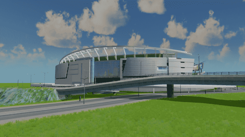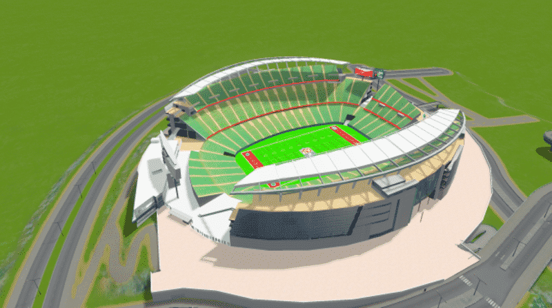 – Model is slightly raised up (6 meters, retaining wall is included), because the central field is slightly sunken into the ground, resulting into gray textures. Because of this I had to give up any extra amenities (such as built-in pedestrian paths and road overpasses) as reloading the asset would mess up roads. However, once you place the building in your city, you can still replicate the real thing pretty closely.