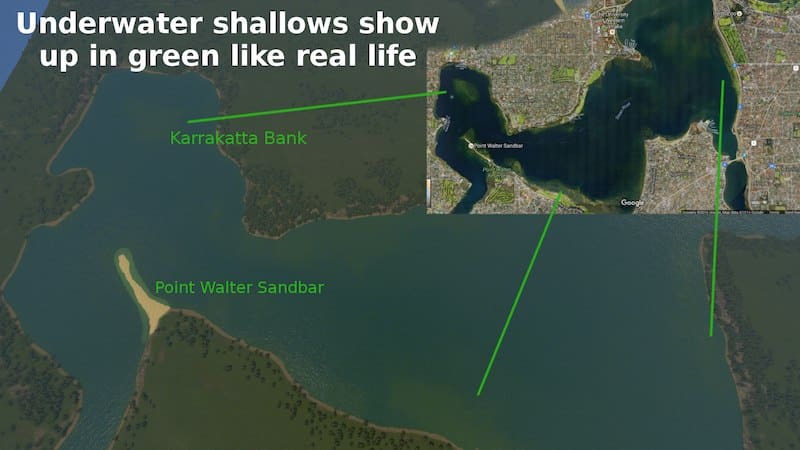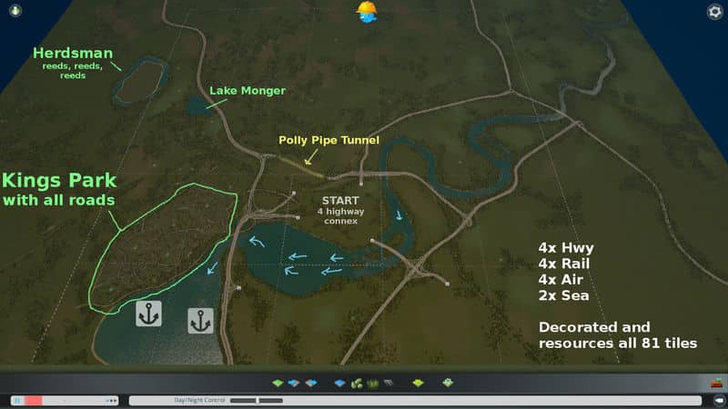 – The bridges across the Swan River are quite low. I had to decide between having shipping lanes right up to the start square with an absurdly tall bridge, or keeping the shipping 2 squares away. I opted for the lower bridge that is there in real life. (the port is actually beyond the edge of this map, it’s a giant city!).