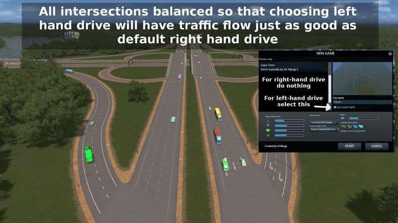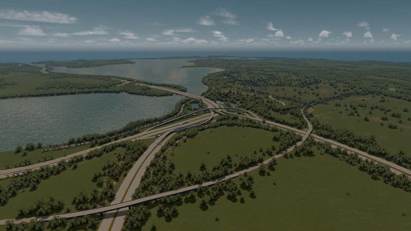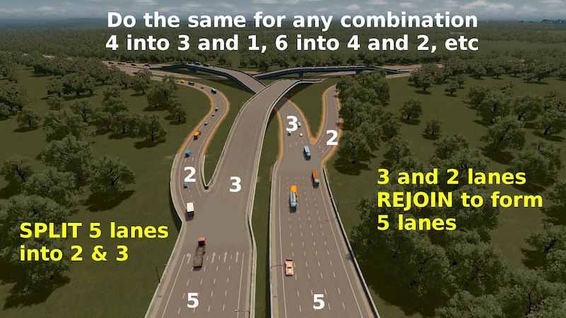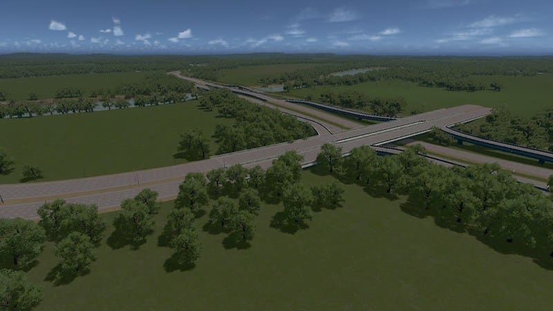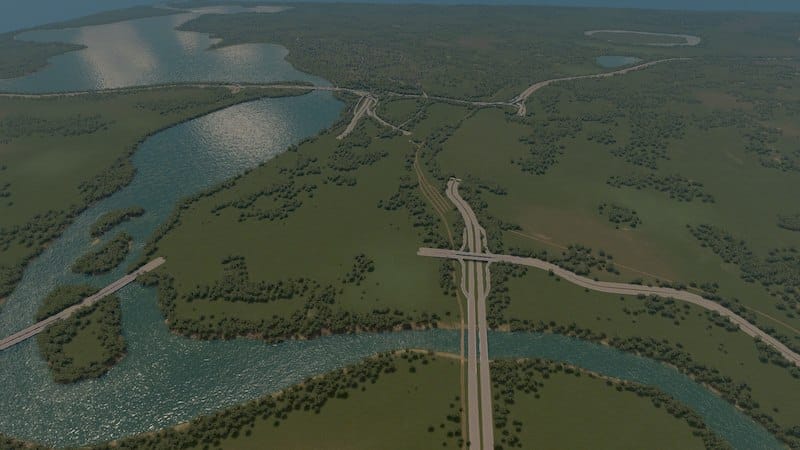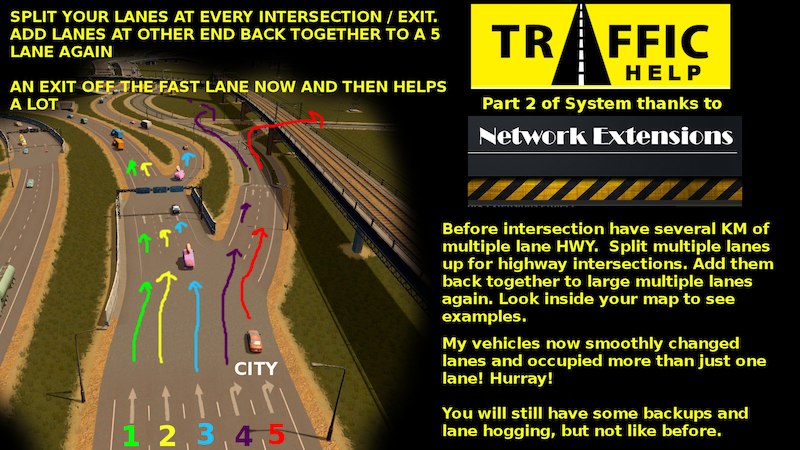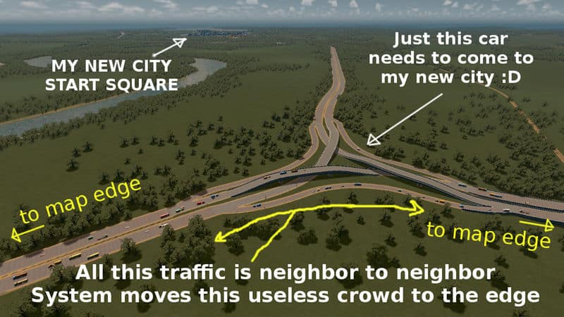 This map serves as a physical demonstration of one way to reduce this annoying game experience, and is hopefully just a nice map on top of that. **You will have to also integrate the “lane splitting” idea into your city where it joins the highways. I can’t do that part, but look at the pics and inside your game as to how the highway exits and interchanges split lanes up.