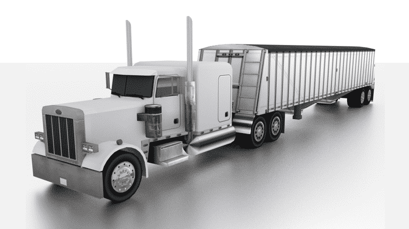The truck is pulling a grain hopper trailer which is used to haul bulk commodity products (such as grain). These trailers are used extensively throughout the United States to transport agricultural products as well as any other commodity that can be hauled in bulk and loaded and unloaded through the trailer.
