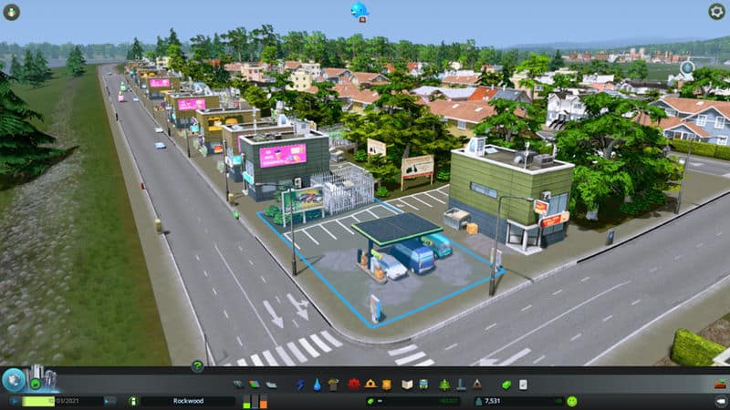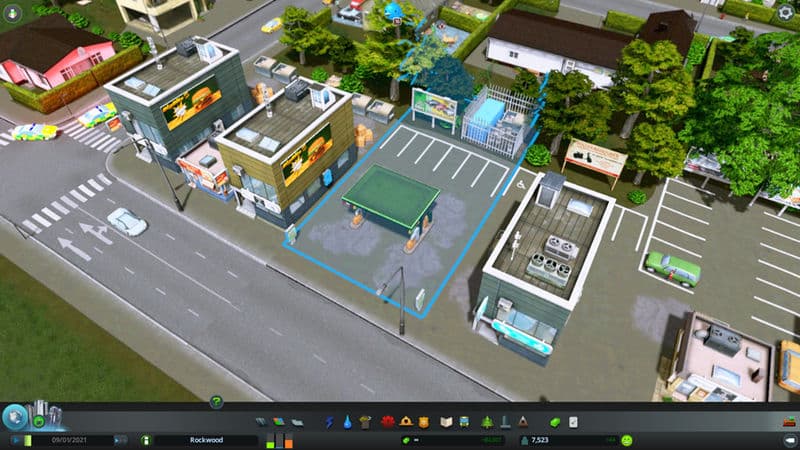 Its the default 1X1 petrol station building but on a larger lot so the cars can actually pull up next to the pumps. It will spawn on 2X2, 2X3 and 2X4 lots. If it is on a 2X2 lot it will have the petrol station itself with some advertising signs. If it is on a 2X3 lot it gains a row of parking spaces at the rear. On a 2X4 lot it also gains a substation and billboard behind the parking spaces. It will spawn in red, green, black and yellow. It is a level 1 low density commercial building, but you can use the building themes mod if you want it to spawn on other levels.