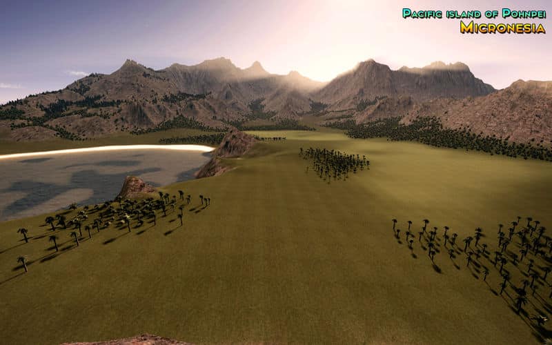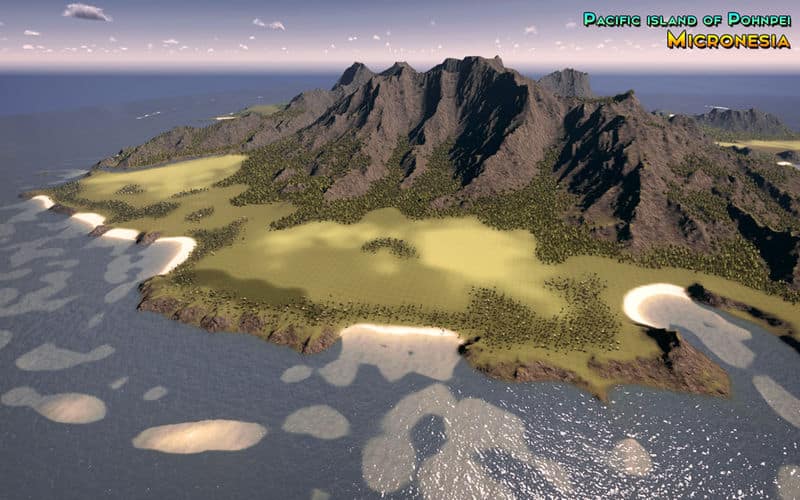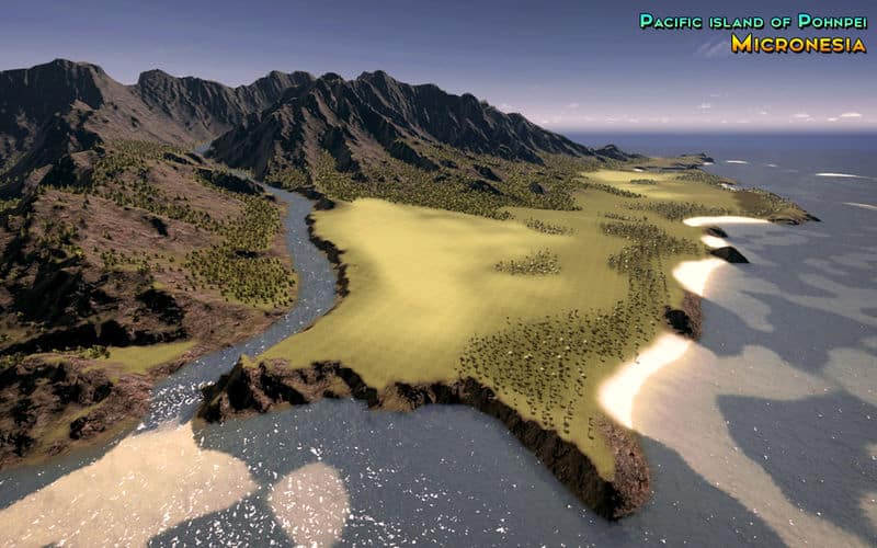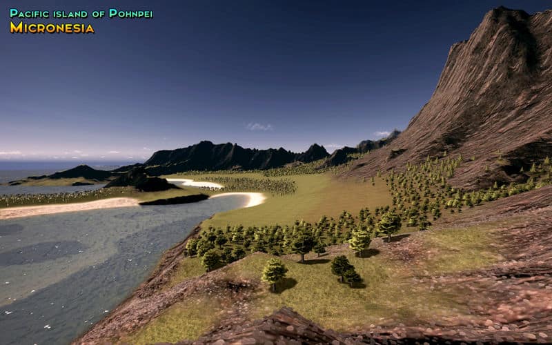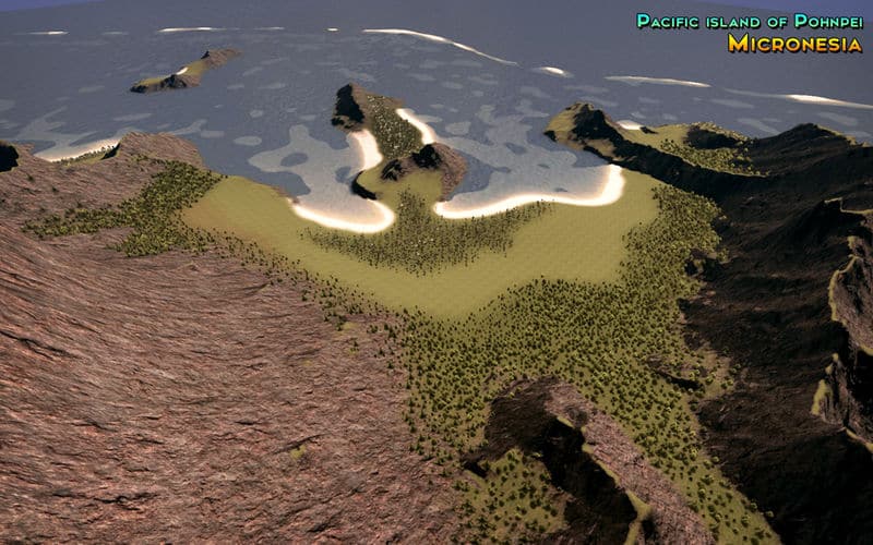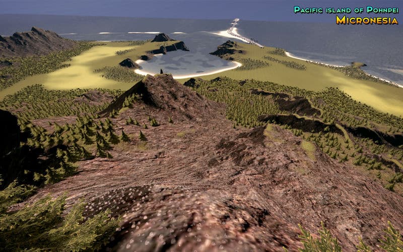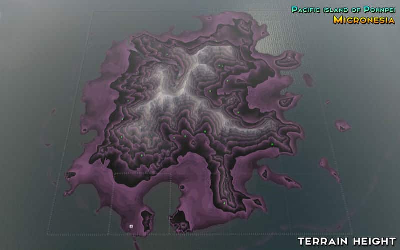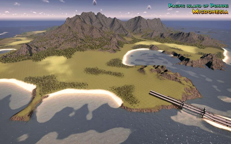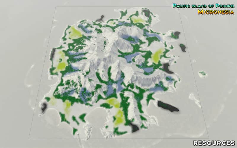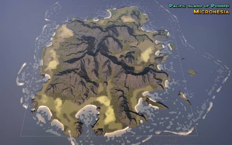 The map is not 100% accurate. Pohnpei is an island covered with rainforest, but this map is more friendly to play. It has moderate amount of trees just enough to look good. Mountains and hills has also been scaled up to create steeper slopes and higher cliffs. Cities built below feel small with all those overlooking mountains.