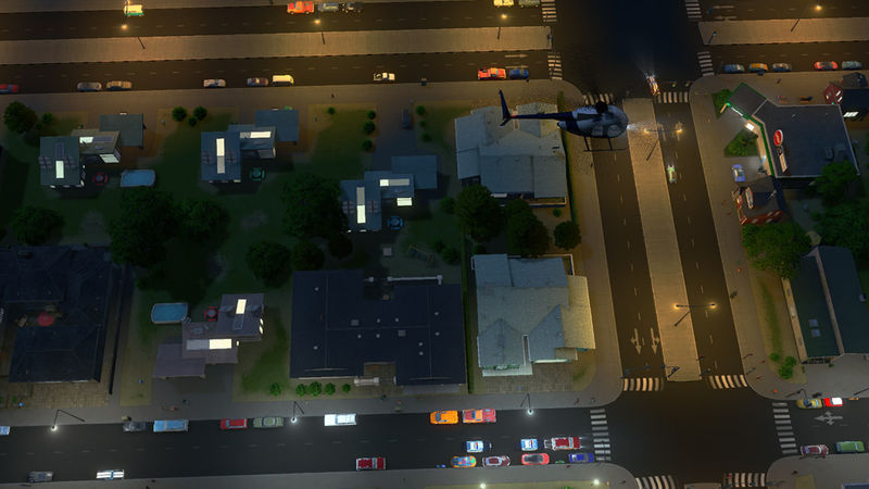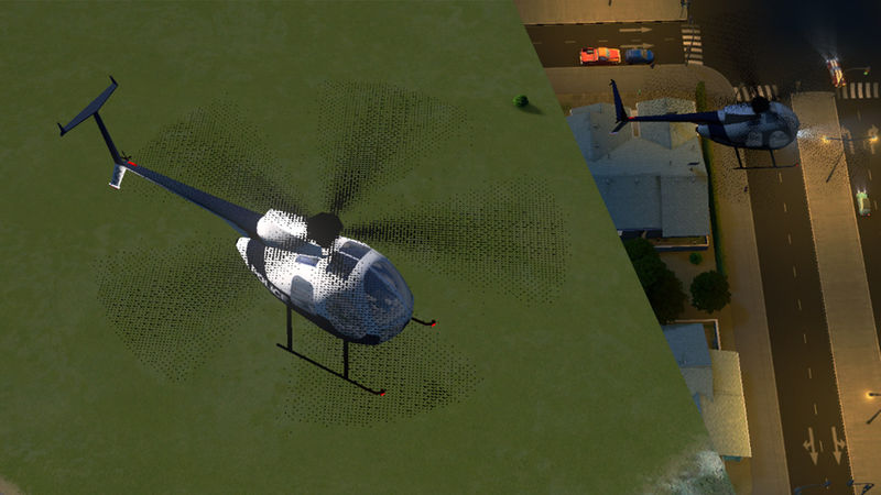 The car under the helicopter can’t have its headlights on, sorry, it is a limitation of the game. If we find a way to lift this, I’ll update immediately.