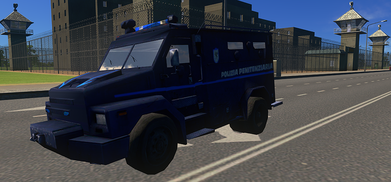 Its vehicle livery is dark blue with a light blue stripe along the side and Polizia Penitenziaria in white letters under the stripe.
