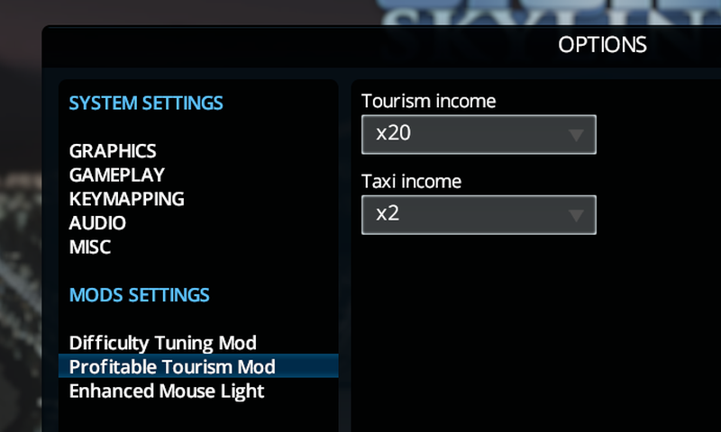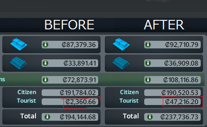 The tourism income is increased in 5 times. Can be set from x2 to x100 in the game options.