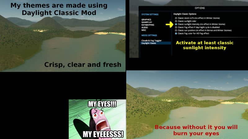 When I design themes, I use Daylight Classic mod. Although it’s not required, this theme looks pretty awful without it. That’s pretty much true of most themes based in the tropical biome.