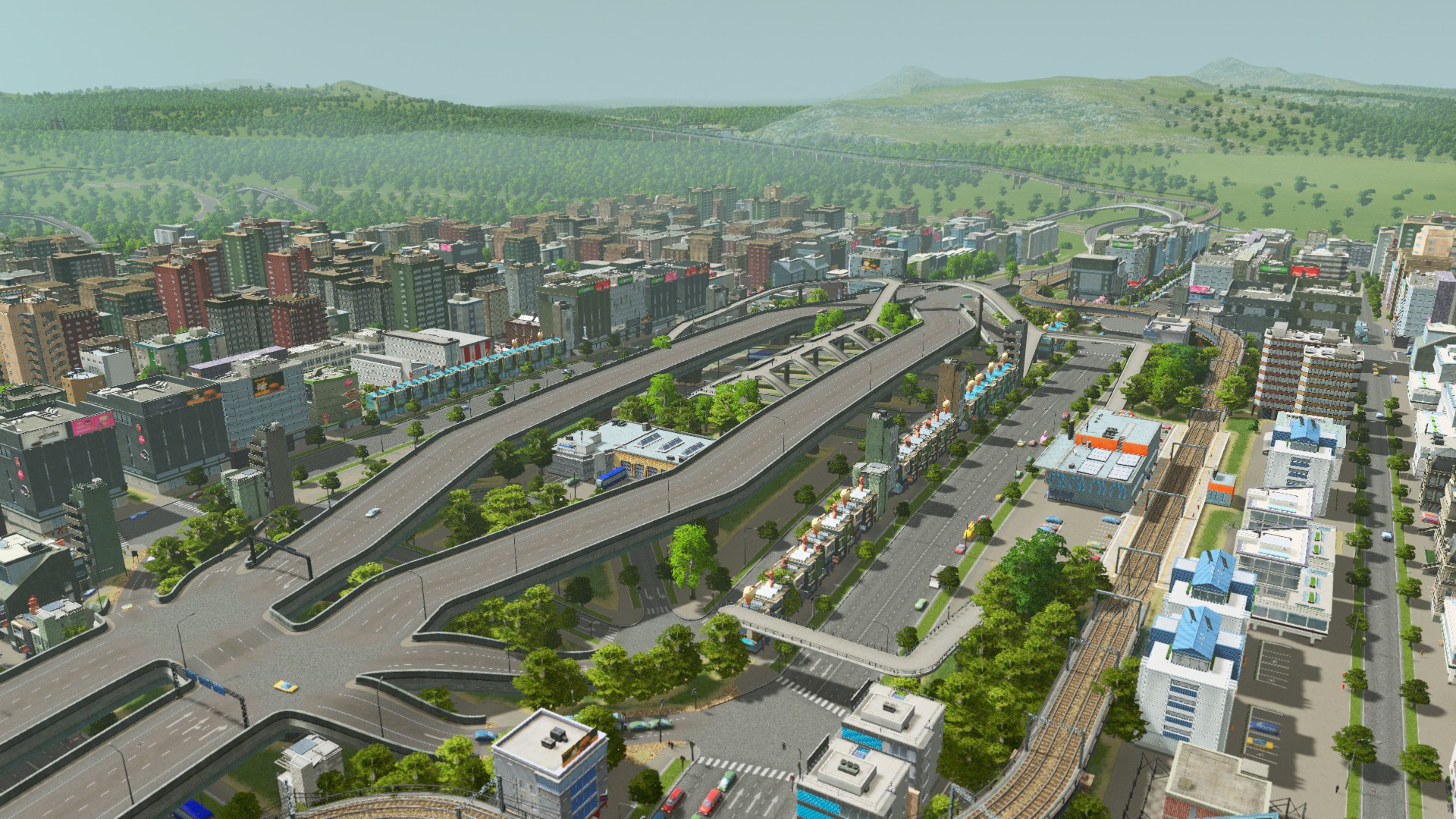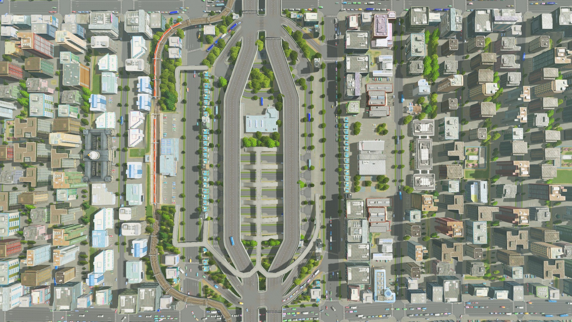 This place works like the one without highway overpass. The brown pebble paths show you again where bus depot and subway station can be placed. You could put any railroad tracks between the highway lanes because they offer enough space for it, but only if the highway is at least one level higher.