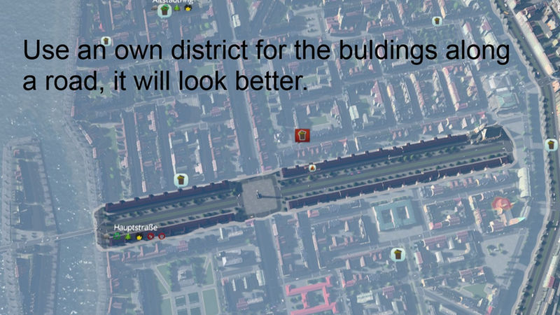 Damit es am besten aussieht plaziert die Gebäude entlang einer straße in einem eigenen Distrikt und glättet das Terrain.