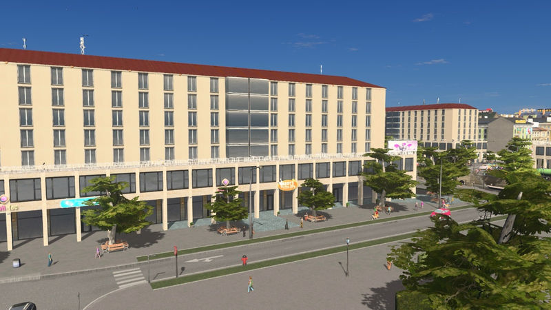 Damit es am besten aussieht plaziert die Gebäude entlang einer straße in einem eigenen Distrikt und glättet das Terrain.