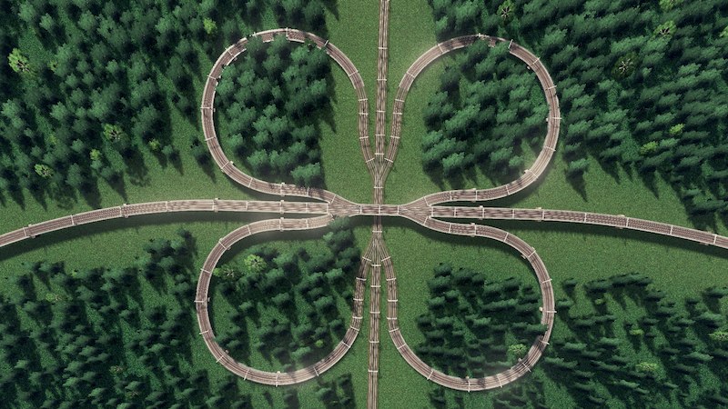 This is a junction of two railroad lines one of which is elevated. The “ramps” are pretty tight but the slopes on them are pretty gentle.