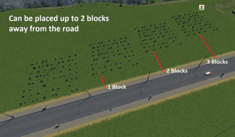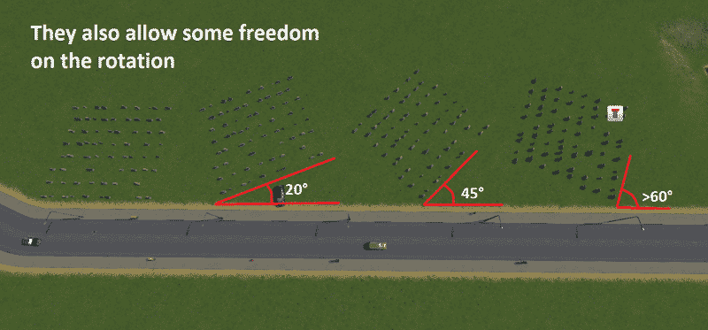 Can be freely placed, rotated and won’t flatten hills. It DOES require a road connection to work properly but it does not need to snap to roads.