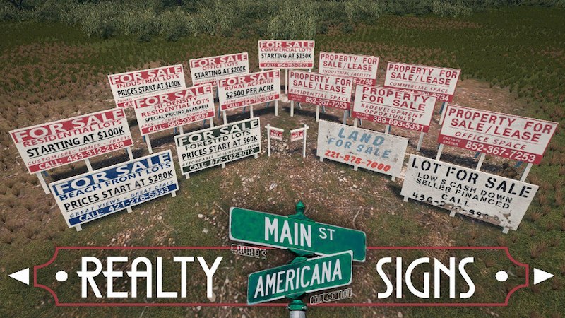 A pack of 16 realty sign props based on those found throughout the United States. I thought this would be a useful all-in-one pack since there are essentially none of these kinds of signs on the workshop despite their prevalence in the real world.