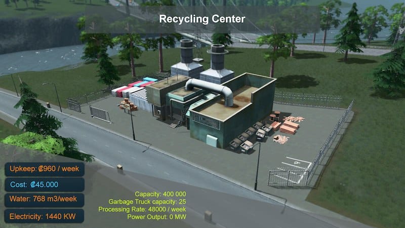 The Recycling Center does not generate any power either, since it doesnt burn the garbage. Instead it has a high powerconsumption of about 1440Kw, the water usage is also adjusted, to reflect recycling. We all want clean aluminium right?