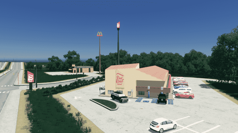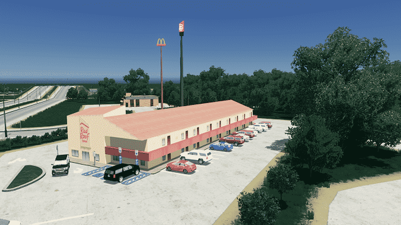 Red Roof Inn is a chain of American hotels and motels, with over 500 locations within America. Locations are distinguished by red roofs as per their name. This model was based on many different locations in New York, North Carolina, Ohio, and Tennessee.