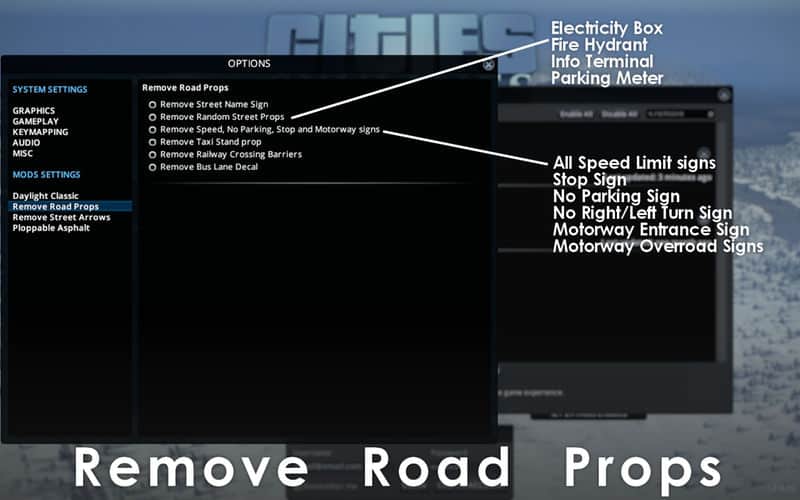 This mod allows you to remove many props under different categories that are located in the settings (see the pictures above) including all speed limit signs, stop, street name, no turn, no parking signs, motorway signs, taxi stand, and more !