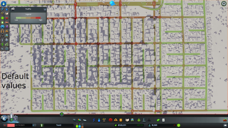 This means that low density residents travel a lot more by car, while high density effectively halve their car use, compared to the vanilla game.