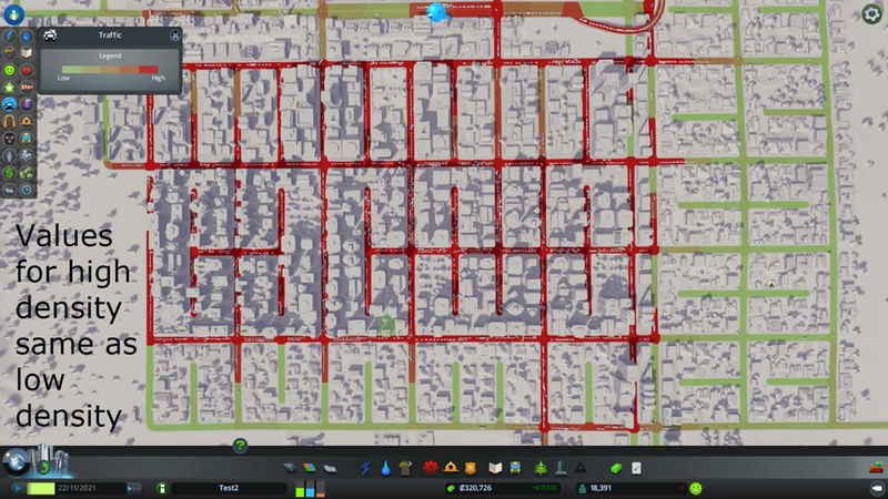 This means that low density residents travel a lot more by car, while high density effectively halve their car use, compared to the vanilla game.