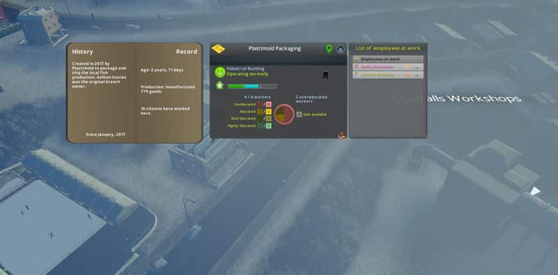 • various stats depending on the type of the building : number of clients served for commercial, quantity of goods produced for industry …