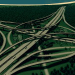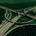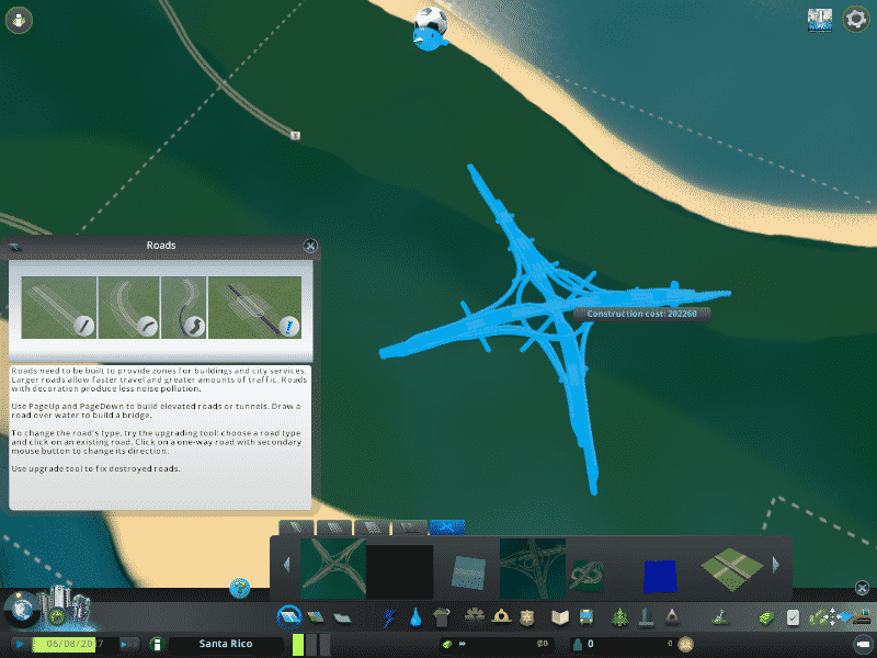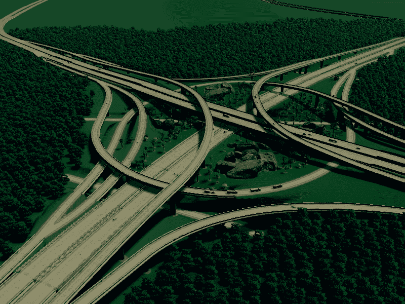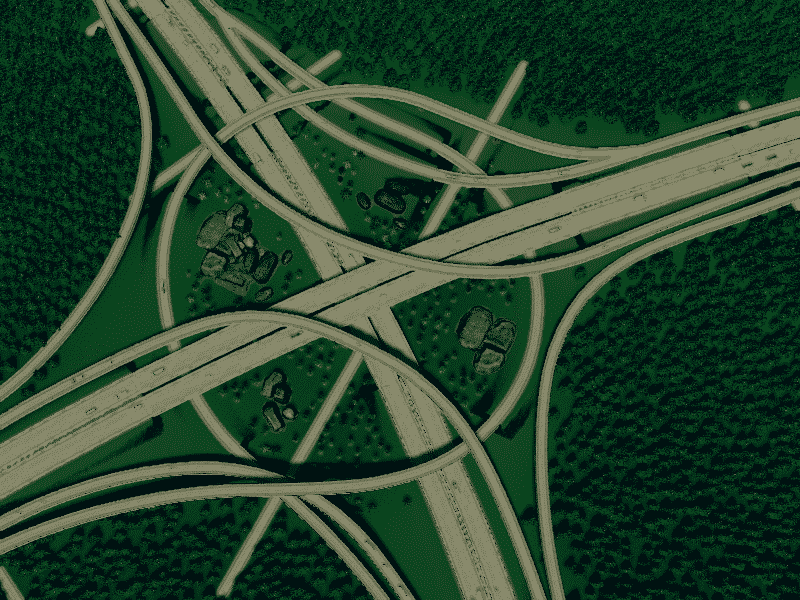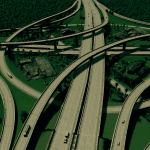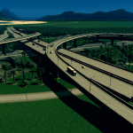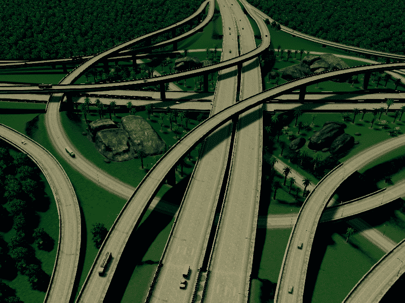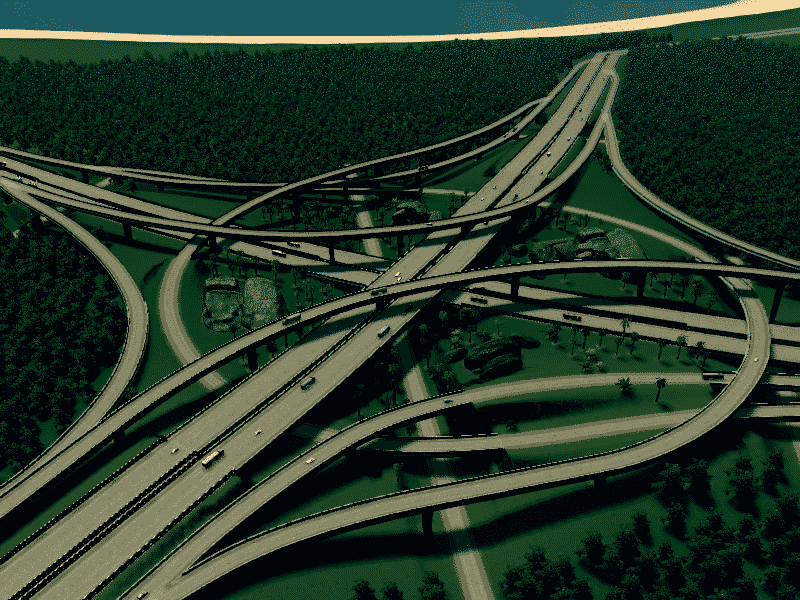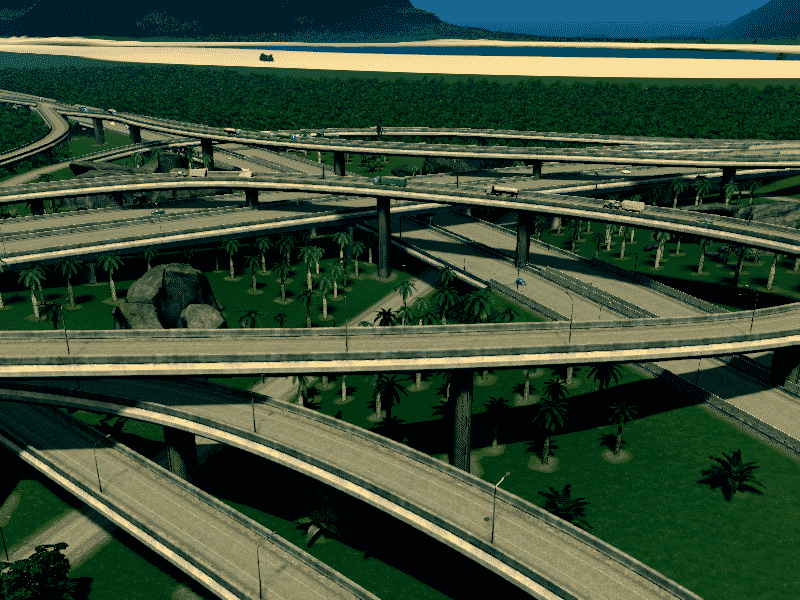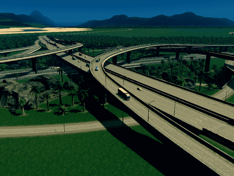 for this intersection i manage very gently slopes. all highway and ramp is elevated, so you can free to make the road or railway below it. use fine road tool ,fine road anarchy,move it . flat land area and xtra lanscaping tool for better look ,compare to building cities skyline the size this interchange is realistic enough