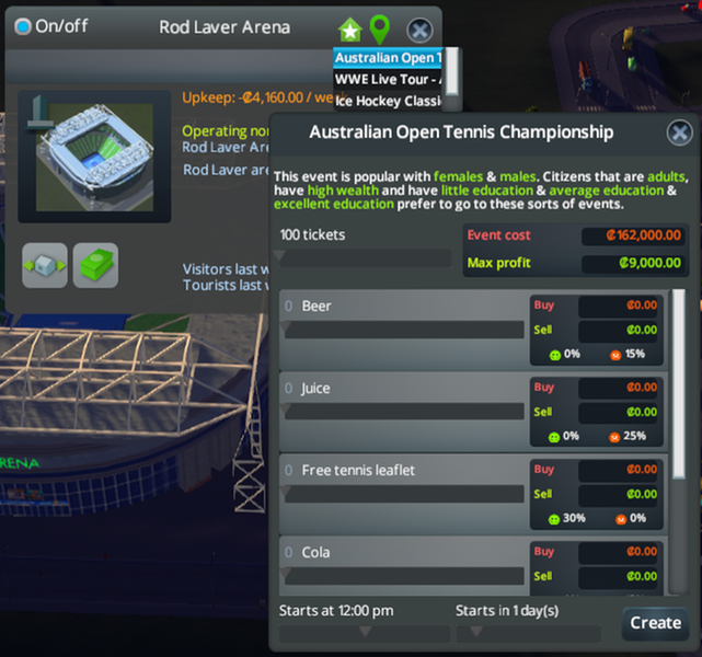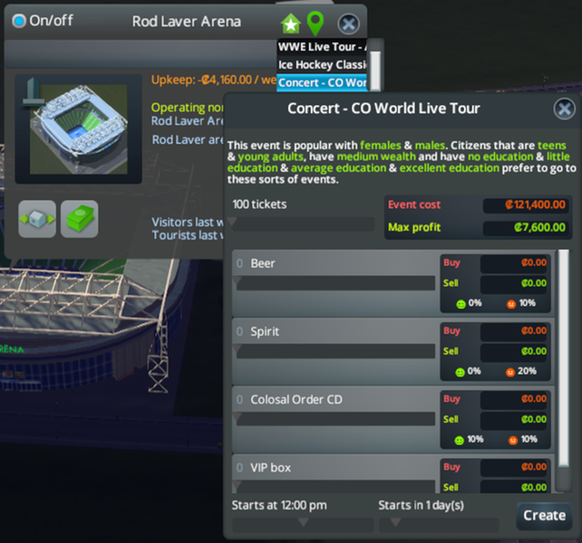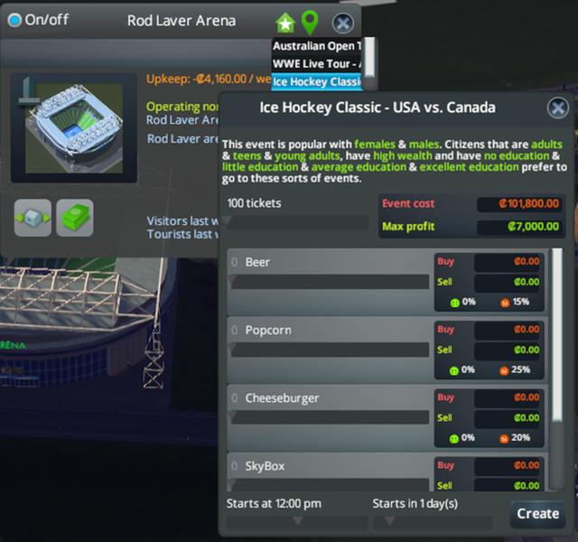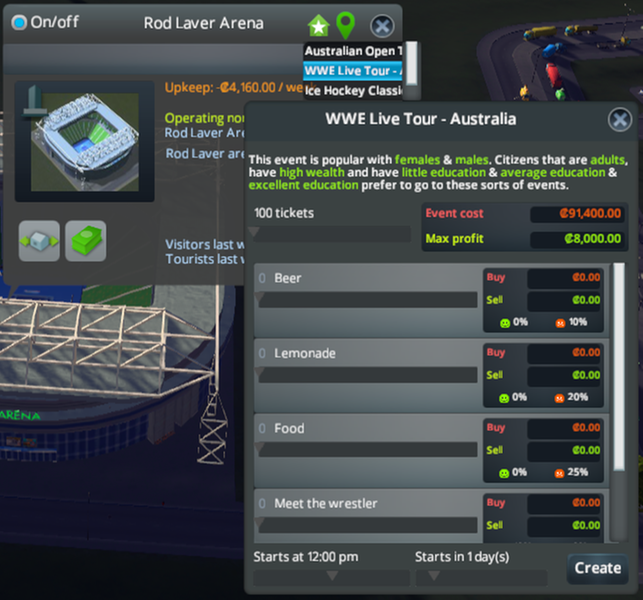 Big thanks to PropaneDragon and Jasmine for the fantastic RushHour mod. Now this arena has four random events (Australian Open, WWE, Ice Hockey Classic, Concert)