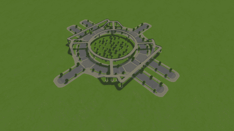 Rond point central (version 6×6 voies). Attention, pour qu’il puisse fonctionner correctement, je vous conseille de retirer les feux avec le mod Toggle Traffic Lights. Rond point par Tom62990.