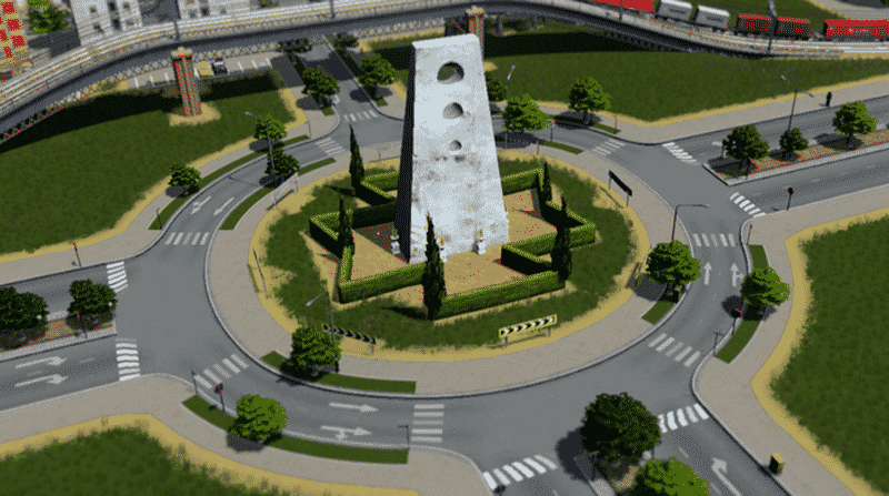 You can plop this roundabout-park everywhere (it comes along without the roads and is circular). It doesn’t need to be attached to a road and that’s why I kept it from producing garbage and it can’t burn, so it won’t cause any trouble.