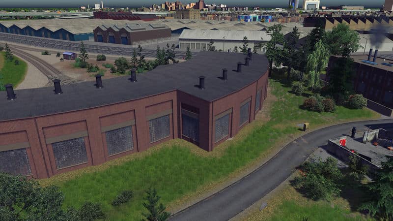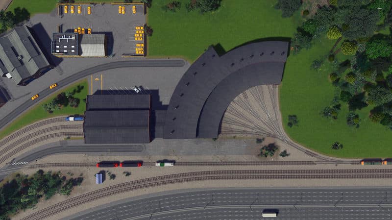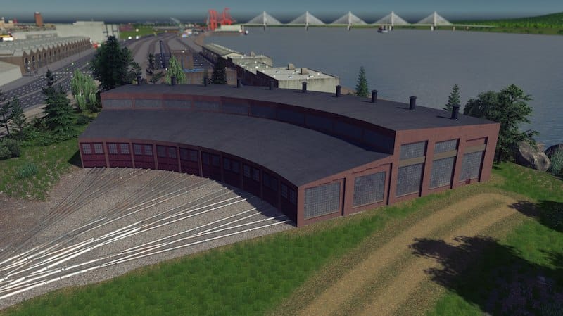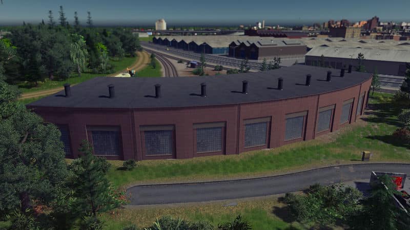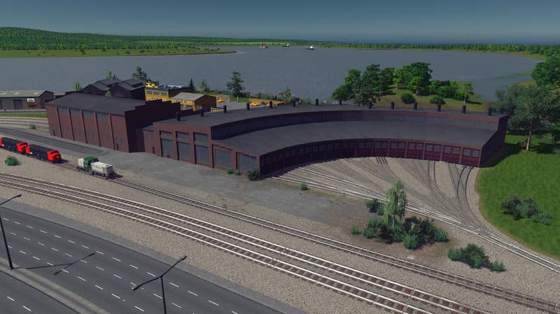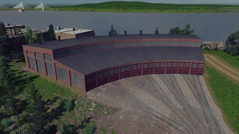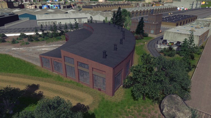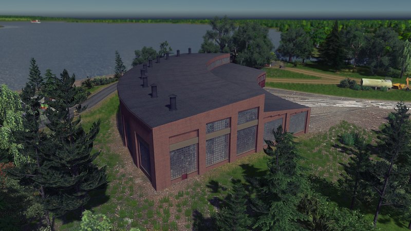 A 2 stall roundhouse for the rail enthusiasts! It snaps together for easy placement, which means the first building will need a road connection. The road can be deleted later as the building doesn’t need it. No tracks are placed by default as their layout depends on the size of the structure. I used One way train tracks in the screenshots.
