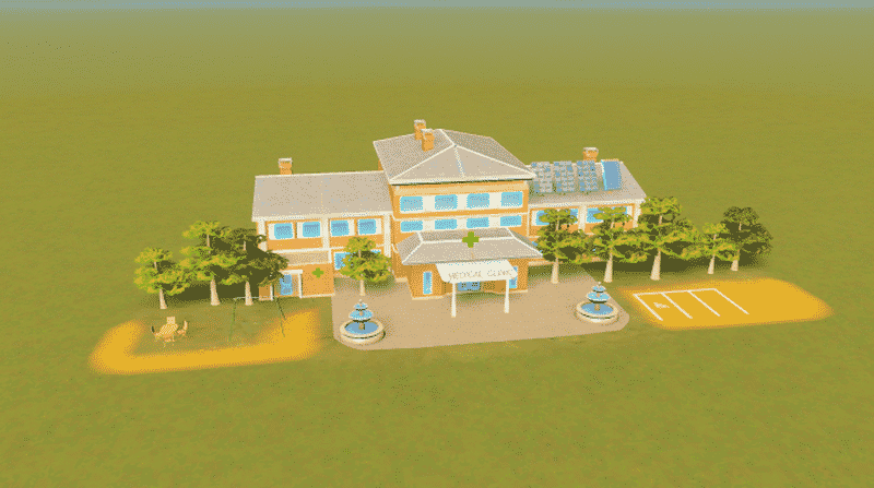 Das ländliche Krankenhaus bietet weniger Platz für Patienten und kostet deshalb weniger. Außerdem hat es durch die Solarzellen auf dem Dach einen sehr geringen Stromverbrauch. Im Gegensatz zur normalen Klinik gibt es einen gestalteten Außenbereich.