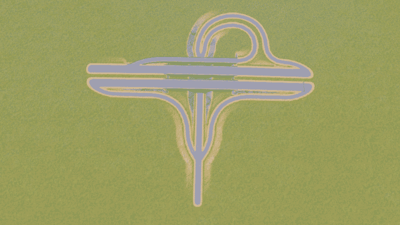 A small trumpet interchange leading a 1-lane highway onto a 3-lane highway (or vice versa). Perfectly suited for rural areas with little traffic.
