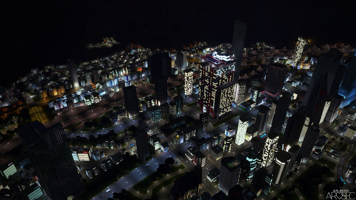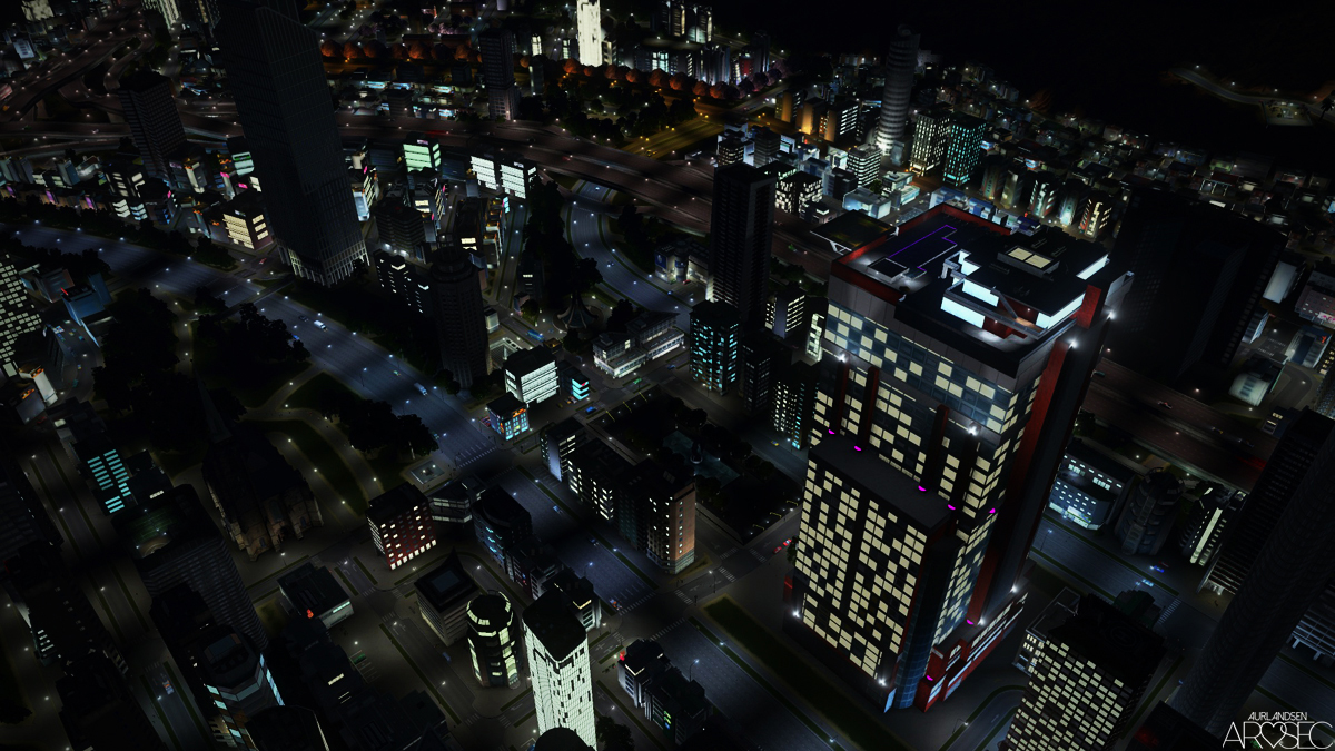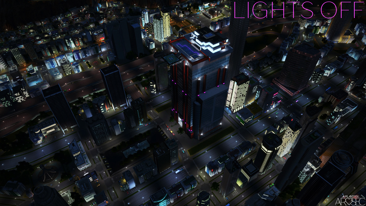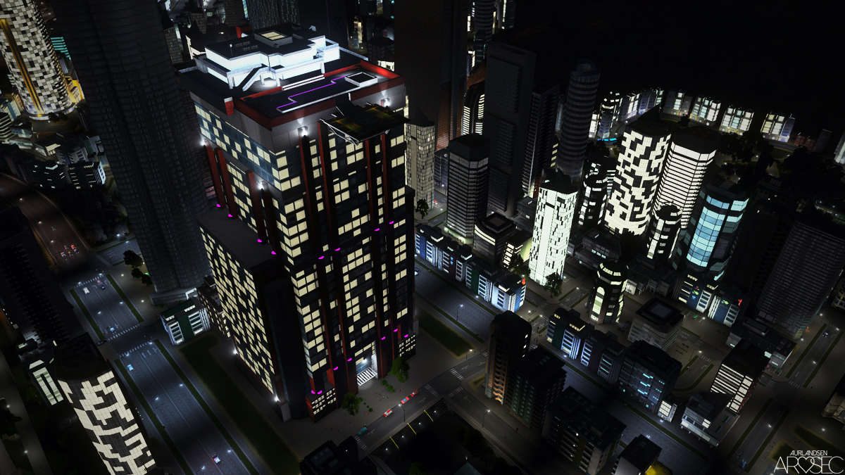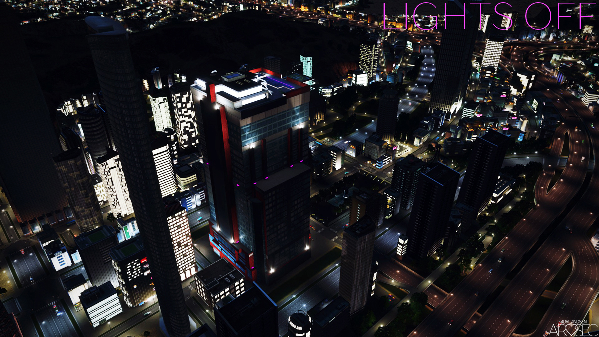 Contains custom purple lighting for After Dark/night. The room lit windows will turn on/off automatically and randomly.