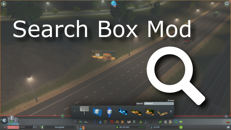 Enables a search box to browse placeable assets ingame. Buildings, props, growables all appear in searches. This includes assets in other mods. As of Update 1.2, this mod supports favourite assets.