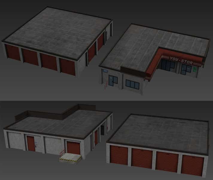 Office building is 623 tris and the storage unit is 362 (LODs are 92 and 10 tris each). Textures are 1024×2048 diffuse, normal, specular, and 512×512 versions for the LODs.