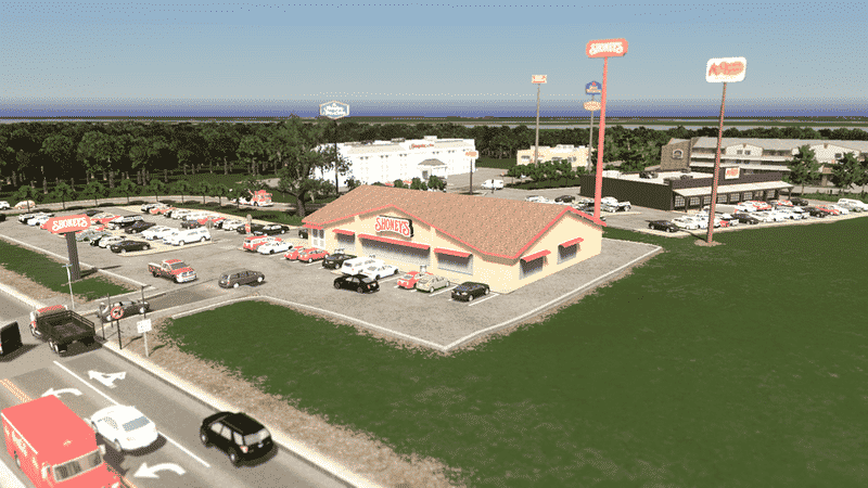 Shoney’s is a chain of sit down American style resturants, whcih serve manily American-style food. There are over 1 000 locations in 34 states, mainly on the in the southern states. This model was based on the Shoney’s in Charleston, West Virginia.