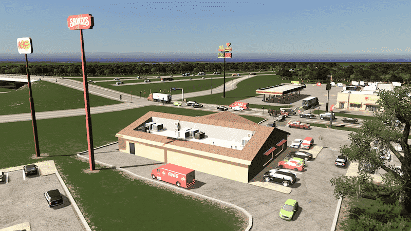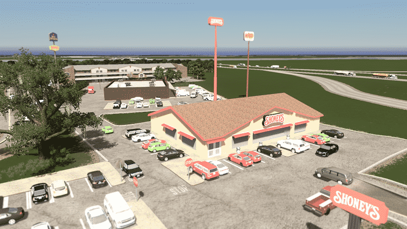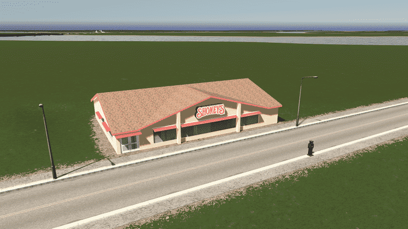 Shoney’s is a chain of sit down American style resturants, whcih serve manily American-style food. There are over 1 000 locations in 34 states, mainly on the in the southern states. This model was based on the Shoney’s in Charleston, West Virginia.