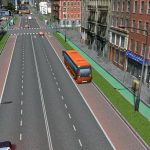A large avenue, decorated with grass, with reserved lanes for bikes and buses on its sides.