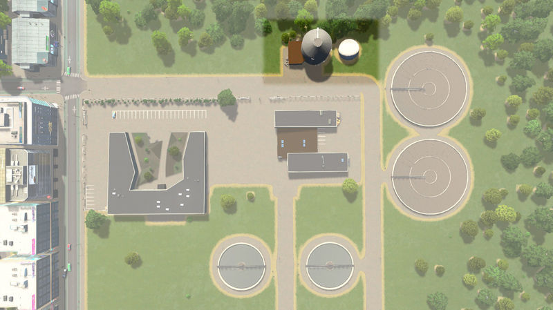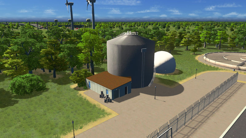 As I modelled most of my sewage treatment facility after Mariagerfjord Rensningsanlæg in Denmark I had to include their little biogas building. Instead of just making it decorative I made it into an incinerator. This way it picks up trash (sludge) from the other buildings and turn it into energy. It’s way more efficient than the real thing, but I also felt like it should actually do something.