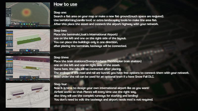 You need only to place this asset on a flat area(much space required) and four buildings(terminals and train stations) and the airport will work.