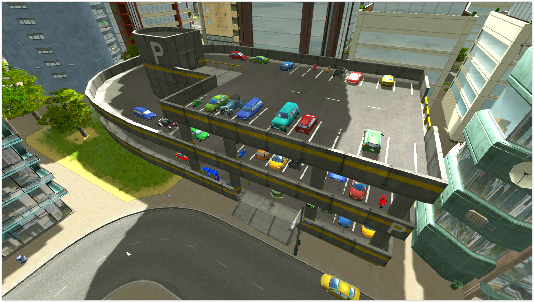 This car park has a 4×4 footprint with a 4×8 total size. This allows you to fill gaps in your zonable areas (particularly when there’s a 90 degree angle in your roads). You may have to manually demolish anything in its path though. There’s entrances on two sides as well as a pedestrian path running through the elevator area.