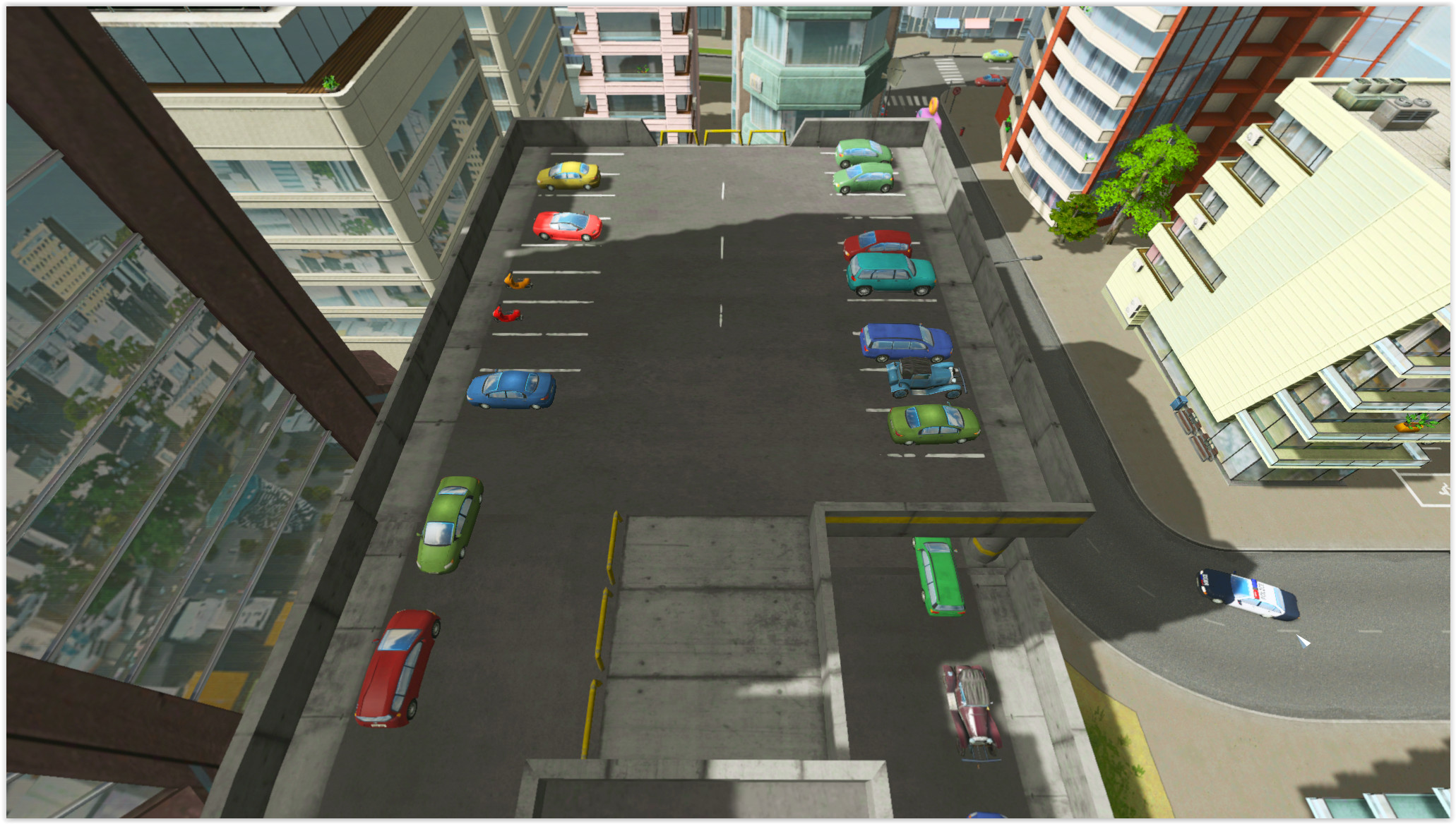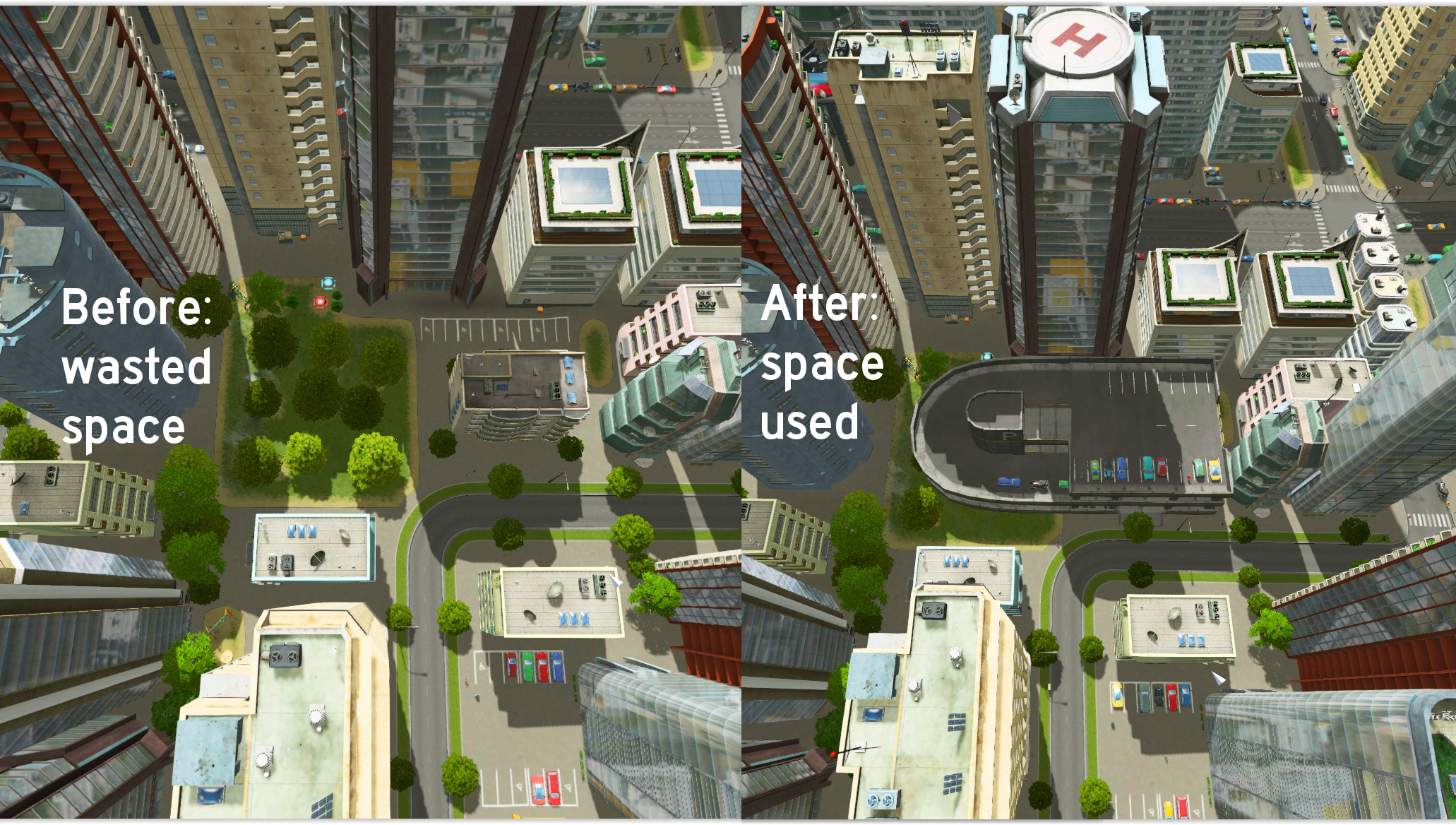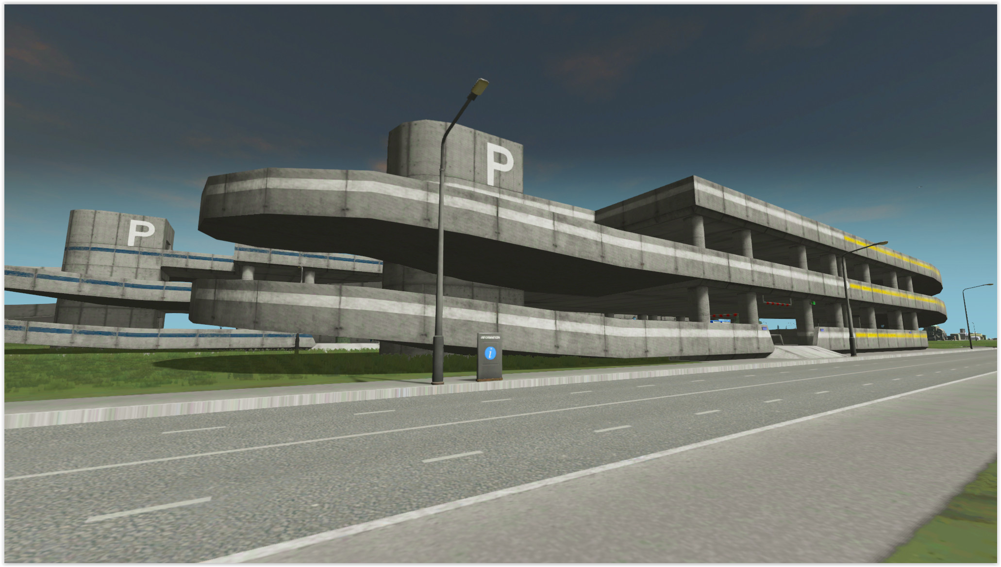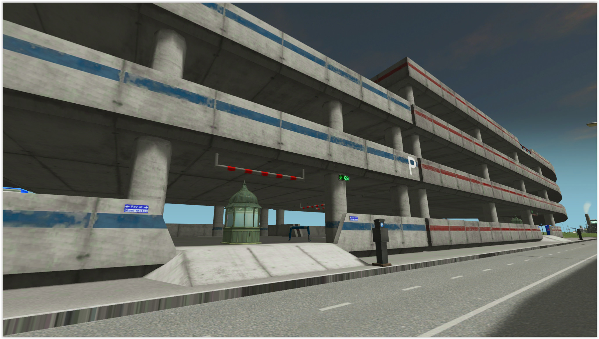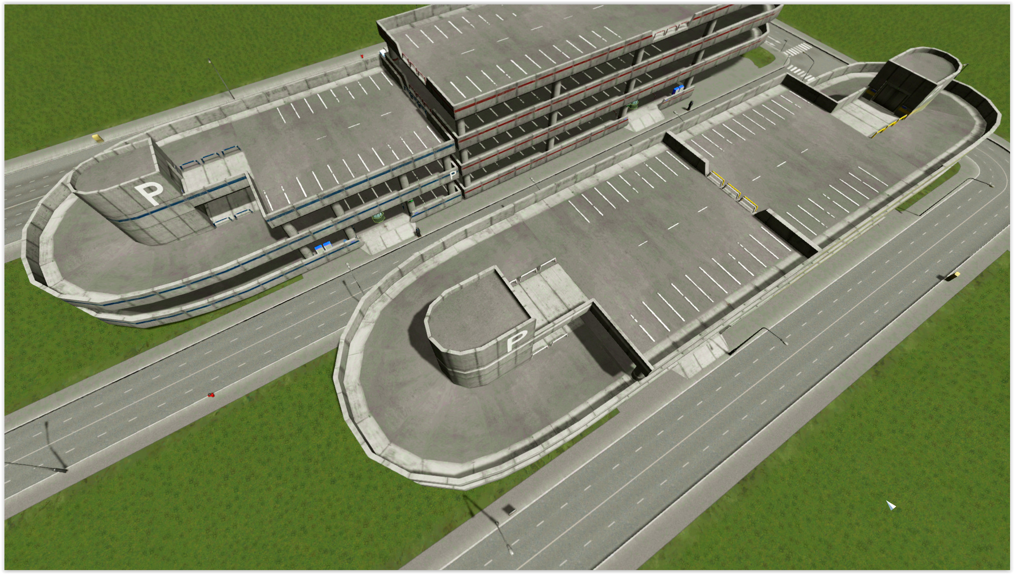 This car park has a 4×4 footprint with a 4×8 total size. This allows you to fill gaps in your zonable areas (particularly when there’s a 90 degree angle in your roads). You may have to manually demolish anything in its path though. There’s entrances on two sides as well as a pedestrian path running through the elevator area.