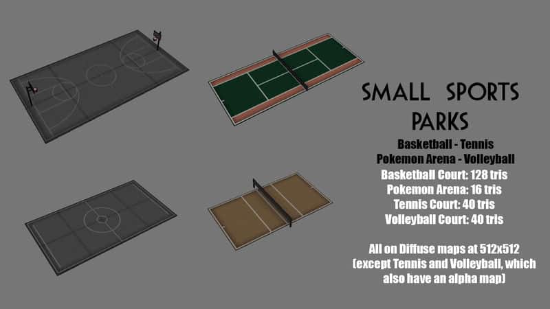 Cims in your cities will be able to shoot hoops, smack tennis balls, bump a volleyball, or look silly fighting with virtual monsters in these four parks. They’re 4×2 and are placed lengthwise on roads and paths.