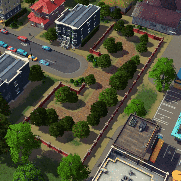 This brick wall is part of a 4 piece set. They are parks that can be plopped anywhere. They also conform to the terrain. Now you can build impromptu parks of nearly any shape or size (assuming you want to surround it with a brick wall…)