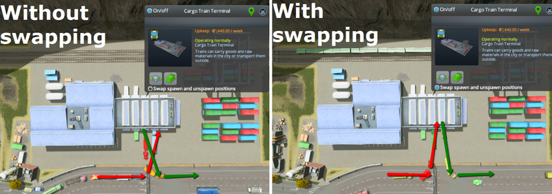 The mod provides a button to swap trucks spawn and unspawn positions of cargo train stations and cargo harbors.